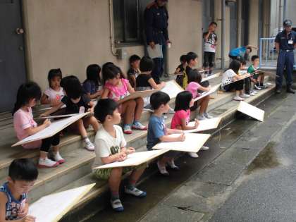 消防署の方にご協力いただき,消防車の写生をしました。子どもたちは,「タイヤが大きいな」「水が出るところがあるよ」など,消防車の特徴をたくさん見つけていました。色んな角度から見たことを基に,消防車の絵を細かいところまで描いていました。消防車の絵を仕上げていきたいと思います。