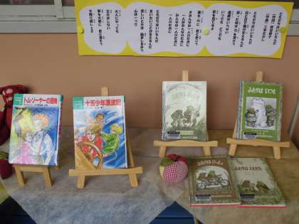 今回は,『友だち』シリーズで展示をしてみました。これから,運動会や学習発表会などの行事での活動,そして授業の中では,話し合い活動の重視など 様々なところで『友だち』の存在を意識しながら活動が増えていきます。互いに自分自身の成長に生かしていけるような友だち作りをしてほしいと願っての展示です。