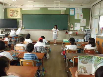 あいさつ運動がはじまるにあたり、高学年の本部役員の人が