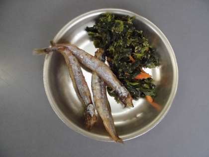 とうがんのあんかけごはん(具) ししゃものからあげ ほうれん草のごま煮 麦ごはん牛乳