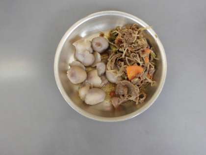 牛肉のしぐれ煮 里いもの煮つけ キャベツのかきたま汁 胚芽米ごはん 牛乳