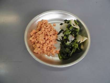 かまぼこと小松菜の炒め物 セルフおにぎりの具(うめさけ) すまし汁