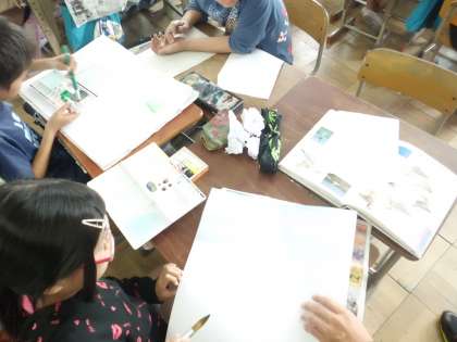 海や空の描き方を知って、早速取り組んでる子供たち。水面や雲を色の濃淡や筆遣いで表現しようとしています。