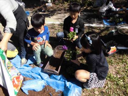2年生が花育活動をしました。球根のことや植え方について学習した後,ノースポールやビオラなどの花やチューリップの球根を植えました。水やりを忘れずにして,大切に育てたいです。