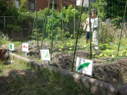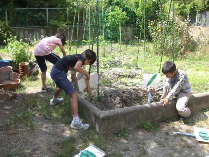 大きな大きな「ミニトマト」,太い「きゅうり」と「ゴーヤ」,見るからにおいしそうな「スイカ」…みんなが描いた絵のように,立派な野菜ができるといいな。