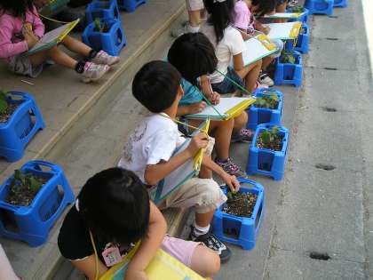 生活科「あさがおをそだてよう」の続編です。葉っぱの大きさ,数,くきの長さをポイントに観察しました。本葉が出て順調に育っていますが,どうしても個人差が…。水をあげていない人もいるようです。あさがおも強い日差しに心なしか元気がないようでした。