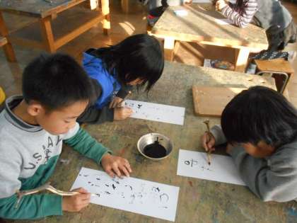 作品が完成後,実際に絵のぐをつけて,紙に文字や絵を書いていました。