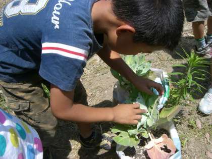 見つけたアオムシとたまごは、キャベツの葉ごときりとって教室へ。