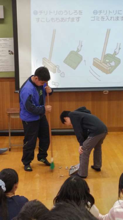 なぜ掃除をするのかを考え,掃除用具の正しい使い方を教わりました。