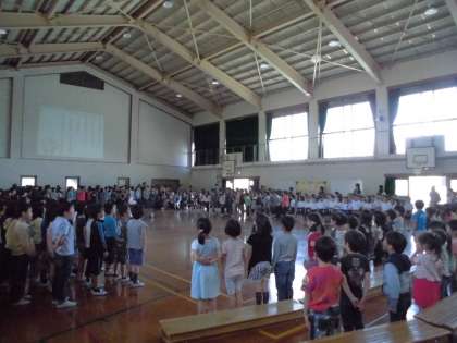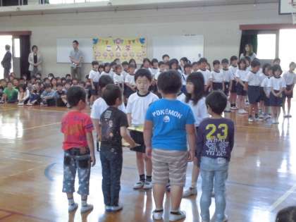 入場の後,全校合唱で『子どもの世界』を歌いました。その後,それぞれの学年からの心のこもったお祝いのことばや歌・ダンスなどのプレゼントをもらいまいました。1年生はみんな笑顔で見入っていました。2年生からは,あさがおのたねのプレゼントももらいました。