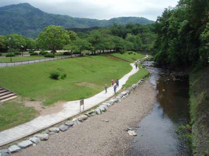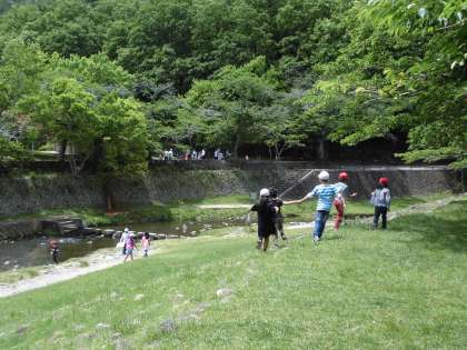 宝ヶ池公園では,オリエンテーリングをしました。1・2年生のなかよしグループで遊歩道にある3つのポイントをめぐりながら宝ヶ池まで行き,折り返してきます。春の新緑がきれいな山々の景色の中で,グループで力を合わせながら,楽しく活動しました。1つ目のポイントは,岩倉川にかかる橋を渡ったところでした。堤防の下に降りて,川のせせらぎを聞きながら進みました。