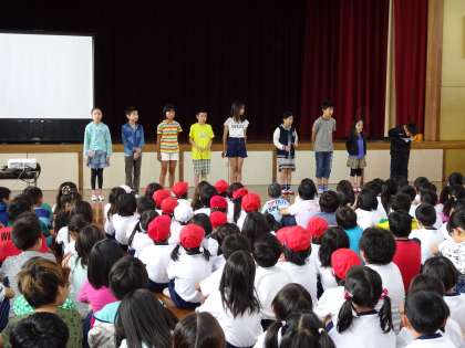 全校児童の前で,意気込みを伝えました。とっても緊張したと思いますが,高学年らしく堂々と言えていました。