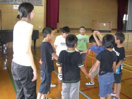 手をつないでフラフープを回す姿は悪戦苦闘ながら、なかなか身軽なところも。さすが子どもです、体がやわらかい!!