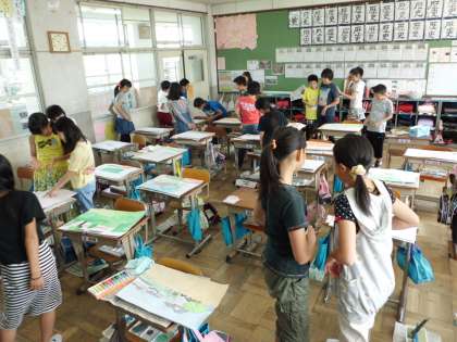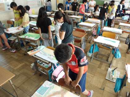 それどれの作品の途中経過を鑑賞し合い,それぞれの工夫の良さ,色づかいの違いなどを交流しています。