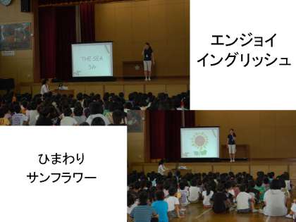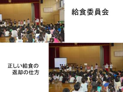 児童集会がありました。はじめに「エンジョイ・イングリッシュ」で夏休みのことや夏に関係のあるものを英語で言いました。次に,「給食委員会」から給食の返却についてのお知らせがありました。最後に「環境栽培委員会」からのお知らせとクイズがありました。とても楽しい朝をむかえることができました。