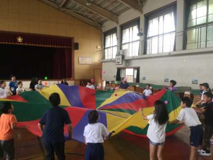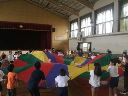 3組の子どもたちと一緒に,パラバルーンで遊びました。「3組さんと一緒に遊べて嬉しかった」「一緒に活動ができて楽しかった」などの感想がありました。