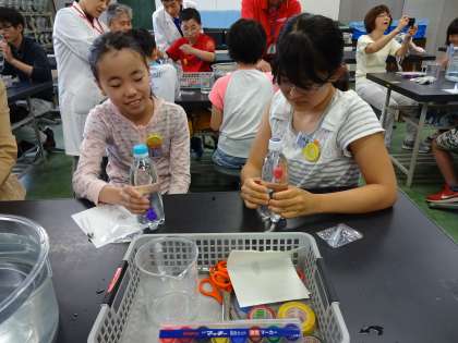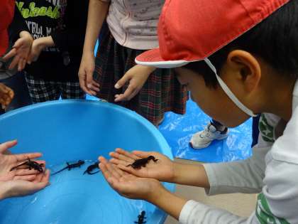 まず,ザリガニ・イモリ・ナマズなど生き物にふれる学習からスタートしました。「ヌルヌルしていて気持ちわる〜い」と言いながらも,こわごわさわって,「ぷにゅぷにゅしていてかわいいな」と大喜びしていました。プラネタリウムでの学習では,星やお月さまの満ち欠けをわかりやすく教えていただきました。実験学習では,『浮沈子』作りをしました。ペットボトルの中で,小さな魚が浮き沈みするたびに,「わ〜しずんだよ」「くるくる回って浮いていくよ」と歓声をあげていました。科学の不思議を感じ取った貴重な学習でした。