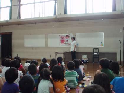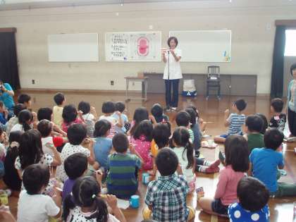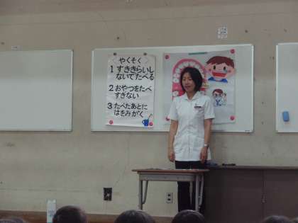 歯科衛生士さんに来ていただき,歯みがきの大切さと正しい歯みがきの仕方を教わりました。最初は,パネルシアターでおやつを食べて歯を磨かなかった口の中はどうなるのかのお話を聞きました。寝る前の歯みがきが一番大切であることを知りました。次に,歯みがきの実習をしました。歯ブラシを鉛筆と同じ持ち方で持ち,こまかくやさしく動かしながら磨きました。大切な6歳臼歯の磨き方も教わりました。虫歯ゼロを目指して,正しい歯みがきを毎日続けてほしいと思います。