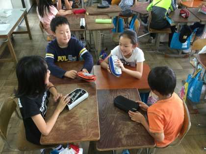 筆箱やノート,えんぴつなどを班で出し合いながら,学習を進めていました。