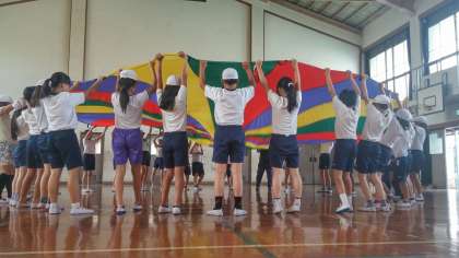 3組のみんなの自己紹介を聞いた後は,一緒にパラバルーンを使って楽しみ, 感想をお互いに交流し合いました。