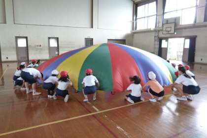 ひまわり学習で,3組の友達といっしょに体育をしました。最初は,3組の友達に自己紹介をしてもらいました。次に,ラジオ体操をした後,パラバルーンを楽しみました。『さんぽ』の曲に合わせて,回ったり,上下に動かしたり,パラバルーンの中に入ったりしました。最後は,感想を伝え合いました。楽しくなかよく活動することができました。これから,あいさつをしあったり,いっしょに活動することを通して,もっともっとなかよくなっていってほしいと思います。