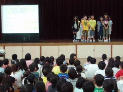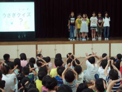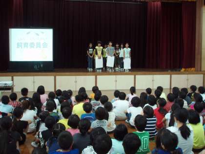 飼育委員会では,毎日うさぎの世話をしています。集会では,飼っているうさぎの紹介,うさぎの○×クイズ,ふれあい週間のお知らせ,カブトムシの成長のしかたの紹介をしました。6月20日(月)からのふれあい週間では,うさぎを触ったりえさをあげる体験をしたりします。生き物と触れ合って,生き物をもっと好きになったり,もっと大切に思えるようになればという思いで活動することになりました。