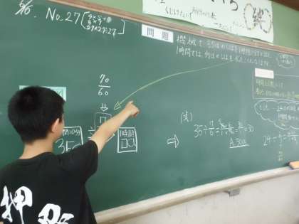 分数の文章題に挑戦しています。時間を分数に表すことがポイントでした。