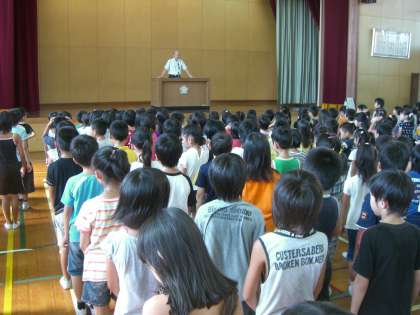 朝会で、夏休みのすごし方について校長先生からお話を聞きました。