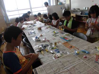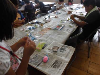子ども達は,テレビやゲームに出てくるキャラクター(スライムやちびまる子ちゃんの友達の永沢君,ウサギやカメなどの動物など)を 思い思いに真剣に作成していました。夏のよい思い出になることでしょう。