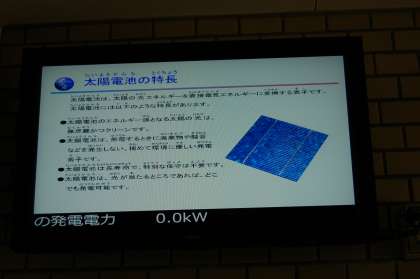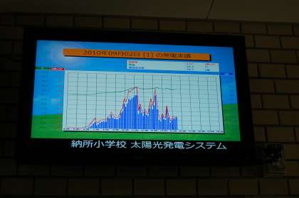 玄関と事務室にはモニターが置かれていて,現在の発電状況(日射強度・気温・発電電力・システム発電電力量・石油代替量・二酸化炭素排出抑制量・森林面積換算)や1日の発電実績のグラフが常に映し出されています。