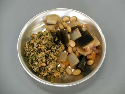鮭と大根葉のまぜごはんの具 五目煮豆 豚汁