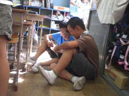 中央の写真は,国語の教科書を見ながら,笑顔で話し続ける男の子二人の不気味な様子です。