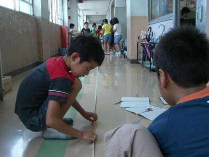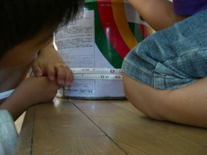 3ネンジャーはろう下の長さをはかったり、ごみばこのまわりの長さをはかったり、