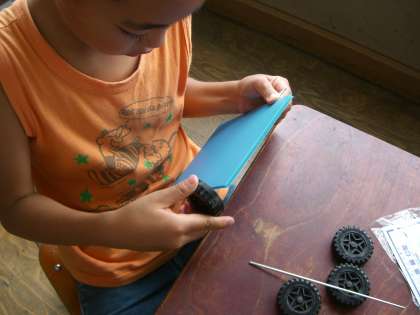 プラスチックだんボールに車じくを通して、タイヤをつけます。
