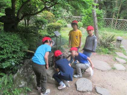 今日は,1年生と一緒に京都府立植物園へ遠足に行ってきました。学年を混ぜてグループを作り,みんなで植物園の中をオリエンテーリングしました。地図を見ながら歩いたのですが・・・たくさん道に迷いました。それでもがんばって歩き,全グループ無事にゴールすることができました。写真は,水琴窟(すいきんくつ)での様子です。耳を澄ませて,美しい水の音を聞きいっていました。