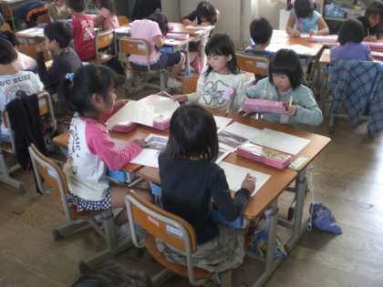 国語では,自動車博士になろうということでいろいろな自動車を調べています。パッカー車,ショベルカー,タンクローリー,ミキサー車……。同じ車を調べる人が集まって,その車の「しごと」や「つくり」について話し合っています。