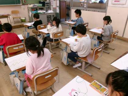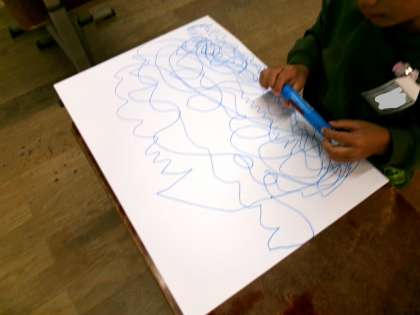 画用紙の上を、線が、あっちへ行ったりこっちへ来たり、冒険しました。できあがった形を見て、クレヨンで絵を描いています。楽しい絵ができそうです。