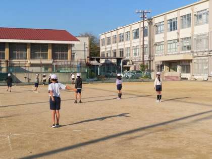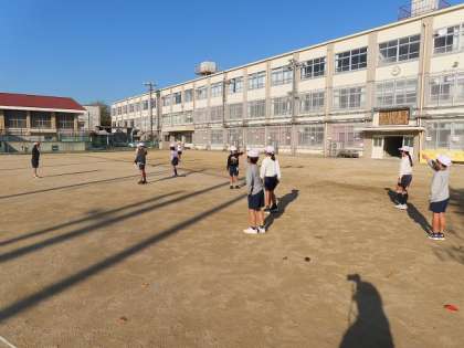 「走りはばとび」の学習に入りました。片足踏切をして両足着地が意識できるように「グリンピース、パイナップル、チョコレートジャンケンをしています」