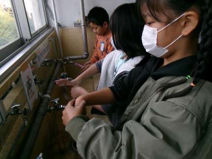 ふと水道に行くと、手洗いをしている子どもたちがいました。