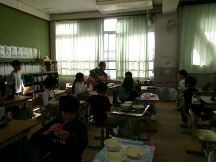 校長先生がギターを手に教室に歌いにきてくれました!みんなで歌を口ずさみながら、楽しく食べることができました。