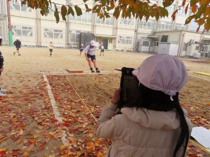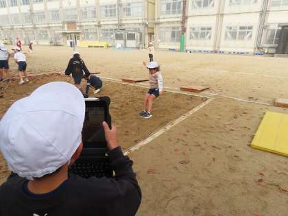 はばとびの学習も後半になりました。今回は、自分がどんな動きをしているのかをiPadで動画を撮ってもらいました。