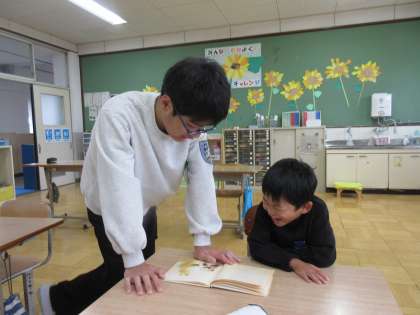 朝、担任が「読書をして待っていてね。」と声をかけて教室を離れ、数分後に戻ると…、6年生が2年生に、「きみのことがだいすき」という絵本の読み聞かせをしてあげていました。