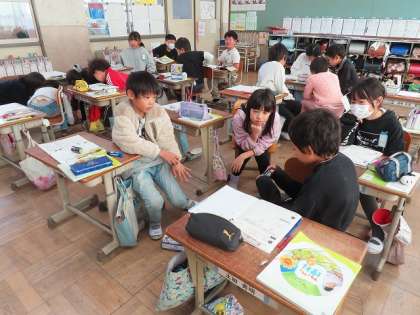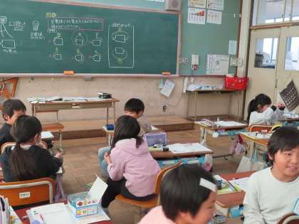 実験結果をグループの友だちと共有しています。明かりがついたときの乾電池と導線のは?つかない時のは?と共通していることも見つけました。「輪」になっている電気の通り道を「回路」ということも学びました。