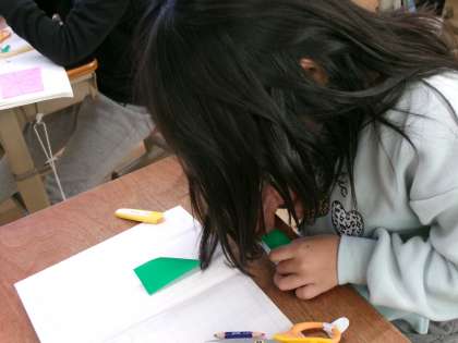 今日は、その長方形の紙をおって切るとどんな形になるのかを考えました。
