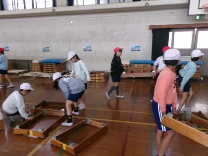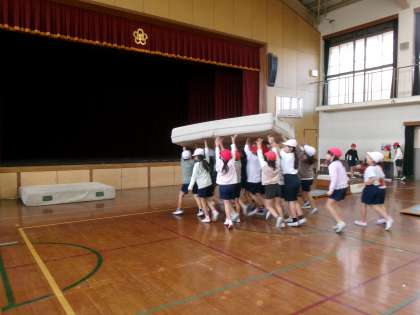 大きなマットもみんなで運びます。