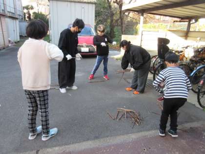 まずは小枝を拾い、燃やしやすいサイズにポキポキ折りました。