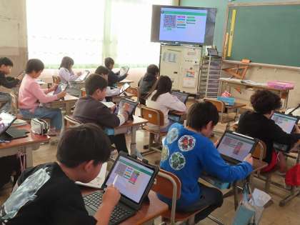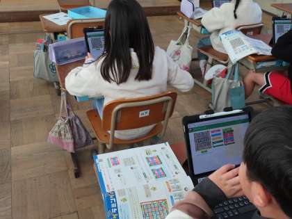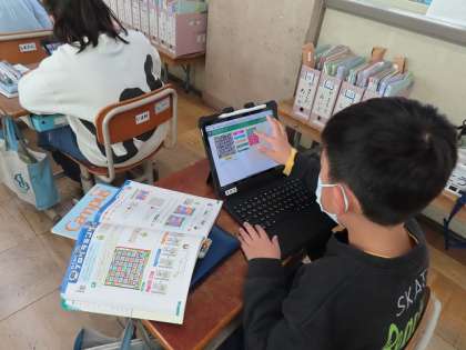 算数で「プログラミング」の学習をしました。車を進ませてアイテムを得るプログラムを考えていきます。「右に向く、前に進む、左に進む」を3回繰り返すなど考えたプログラムを試しています。