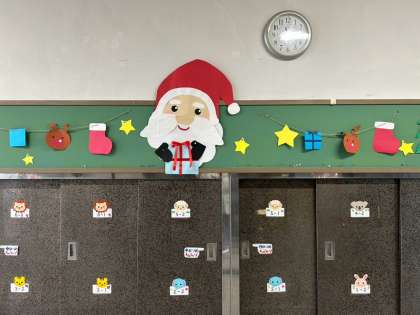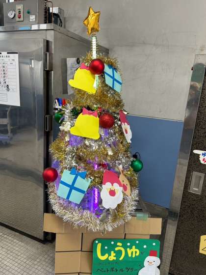 給食を取りに来た子どもたちが、キラキラ光るクリスマスツリーを見て
