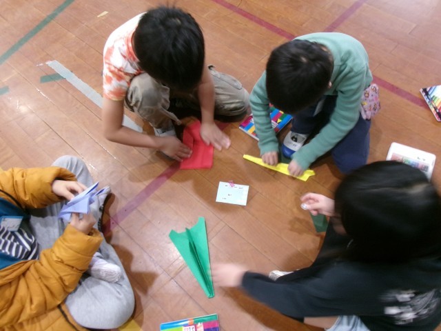 少し大きめの画用紙を折って紙ひこうきを作りました。