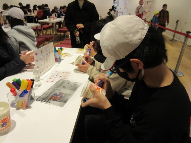 カップラーメンミュージアムでは、まず「マイカップヌードル」を作りました。以前に描いていたイメージ図を見ながら、短時間で描き上げていました。スープや具材も自分好みに仕上げることができました。